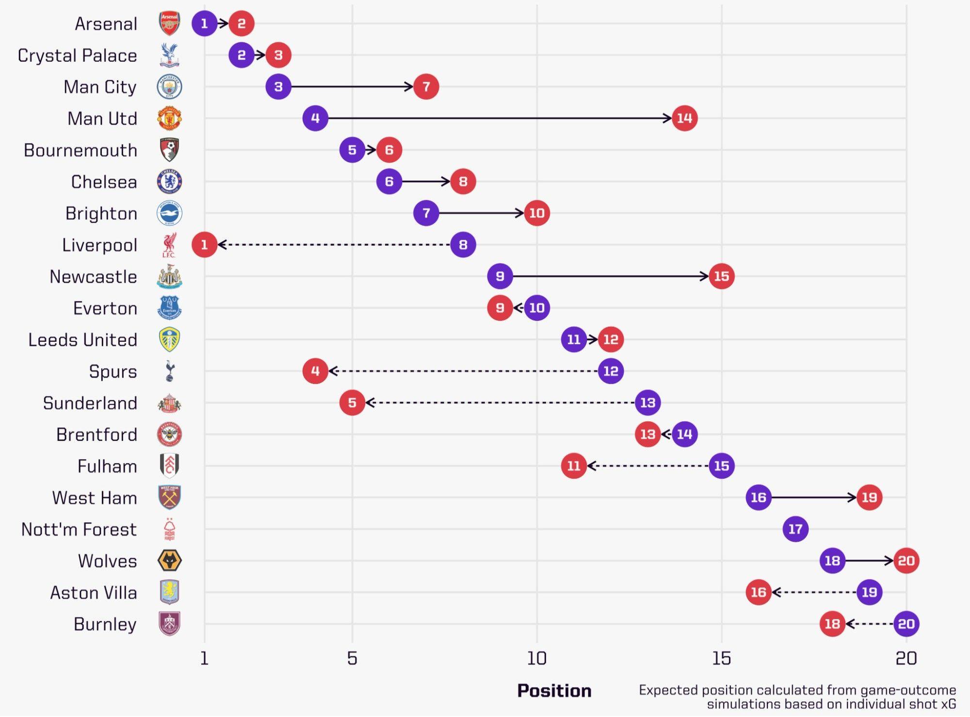 根据该数据机构的统计,目前在实际积分榜上位列榜首的利物浦,在预期积分排名中却仅位列第八。这一结果无疑让许多利物浦球迷感到意外,毕竟球队在赛季初的表现相当抢眼。