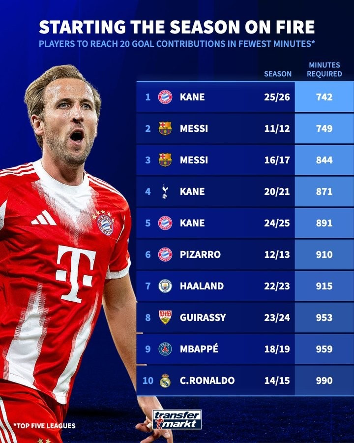 10月1日,足球界迎来一项新的历史纪录:凯恩以742分钟完成俱乐部赛季造进球20个,打破了梅西此前保持的纪录。梅西曾在2012年以749分钟创下这一纪录,当时他在巴萨单赛季攻入91球,效率堪称恐怖。然而,十几年后,凯恩在拜仁的表现更进一步,将纪录提前了7分钟。