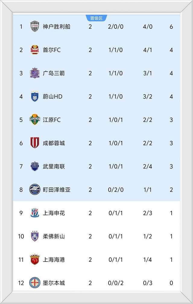 随着申花1-1、神户胜利船1-0绝杀,第二轮亚冠最新完整积分榜出炉。
