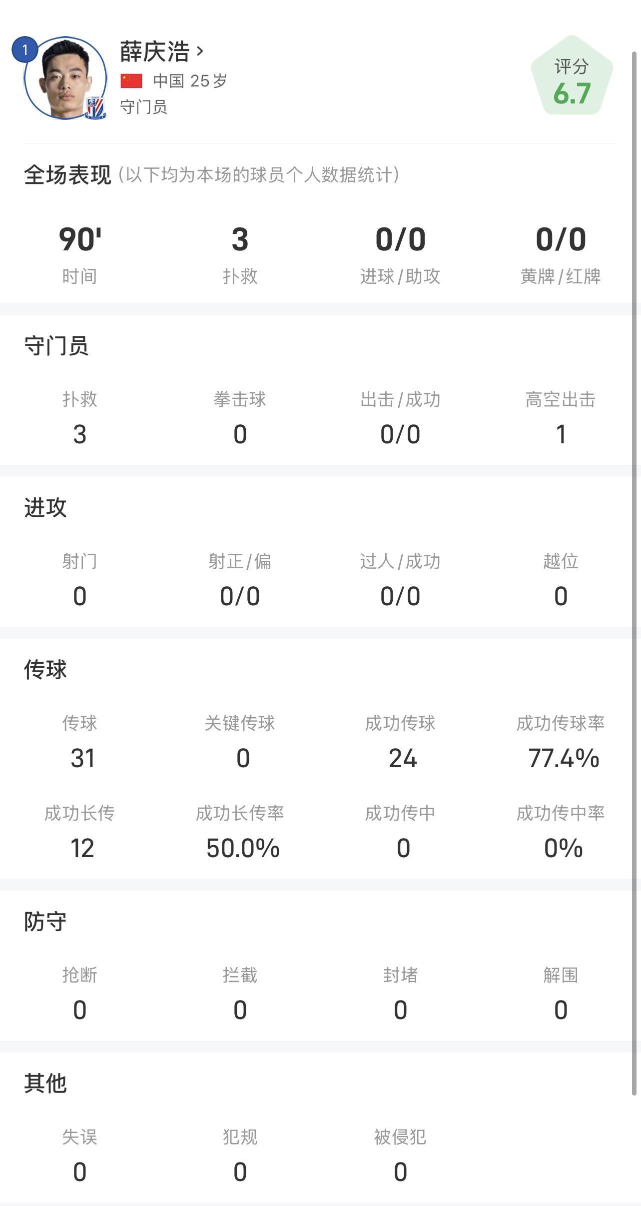 在传球方面,薛庆浩同样表现出色。全场比赛,他共完成了31次传球,其中24次成功到位,传球成功率高达77.4%。这一数据不仅体现了他在后场组织进攻时的稳健性,也彰显了他作为门将的出色脚法。