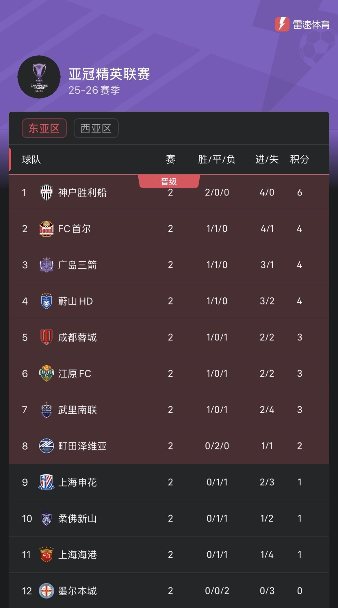 亚精英赛两轮战罢,积分榜排名正式揭晓:成都蓉城以1胜1负积3分的成绩暂列第5位;上海海港与上海申花同为1平1负,各积1分,分别位列第11和第9位。