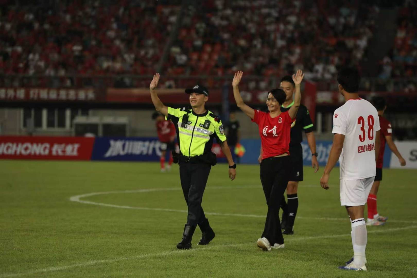 伴随着优美的旋律,全场上万名观众齐声高唱《我和我的祖国》,共同祝福祖国母亲生日快乐,把气氛推向高潮。在歌声回荡中,“跳水皇后”高敏和自贡公安交警陈俊携手为比赛开球,这一瞬间成为全场焦点,也让球迷们感受到了体育与爱国的完美结合。
