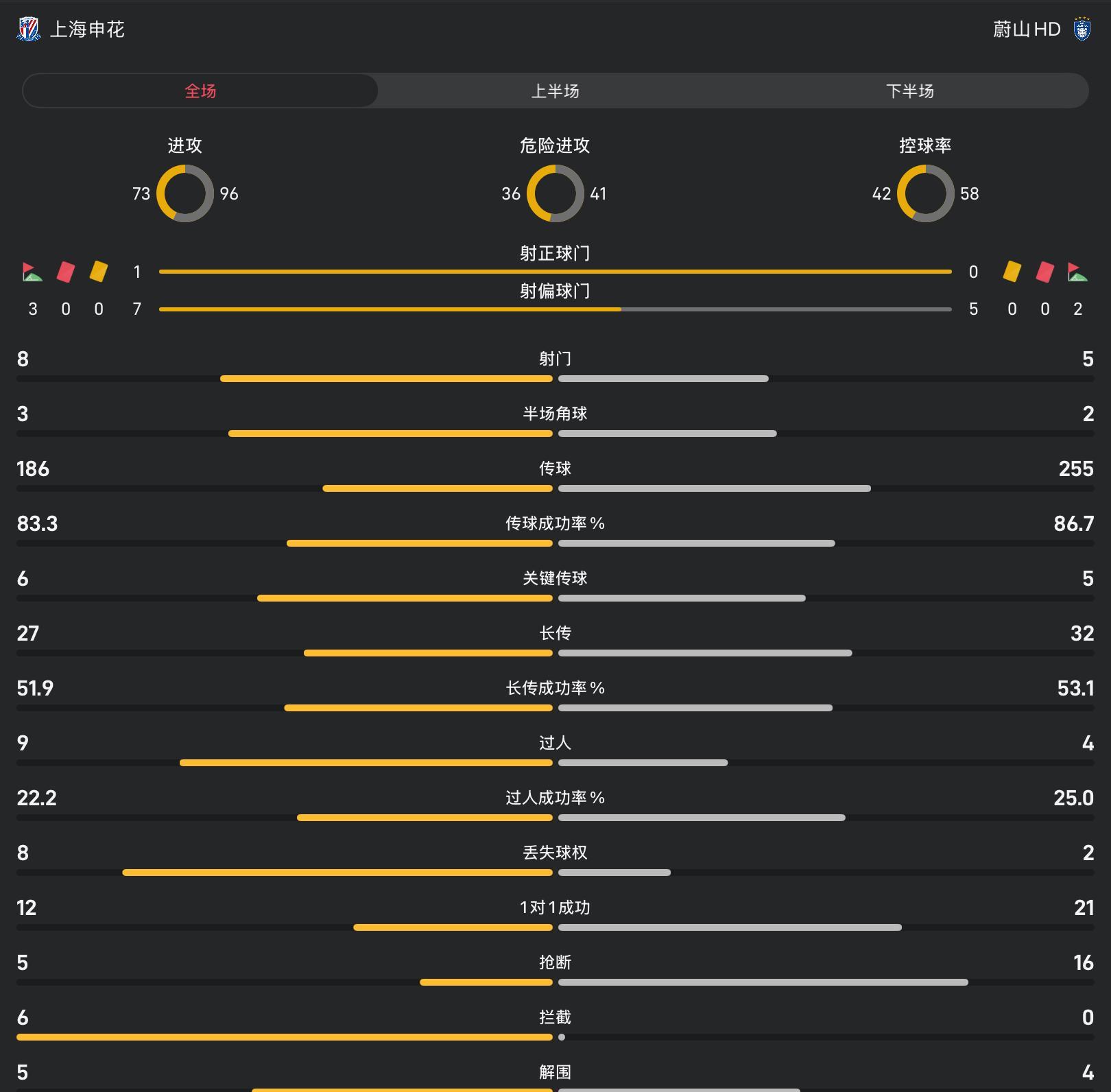 此外,在角球次数上,申花以3次对2次略占上风,但遗憾的是,他们并未能利用角球机会创造出更多的得分良机。