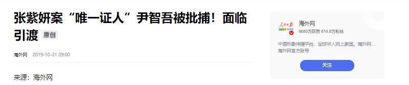 海外网:张紫妍案“唯一证人”尹智吾被批捕!面临引渡