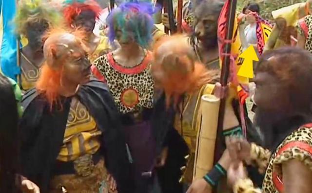 还有就是猪八戒上不远万里请孙悟空出山时,一位小猴子竟然当众摘下了面具,看来这是天气太热受不了了吧。