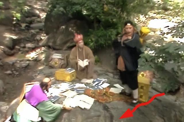 还有就是唐僧师徒四人取到真经后,被老龟掀翻在河水中的镜头,当四人赶到岸上将经书晒干时,注意看下方的大石头上有着“森林防火”这四个字。