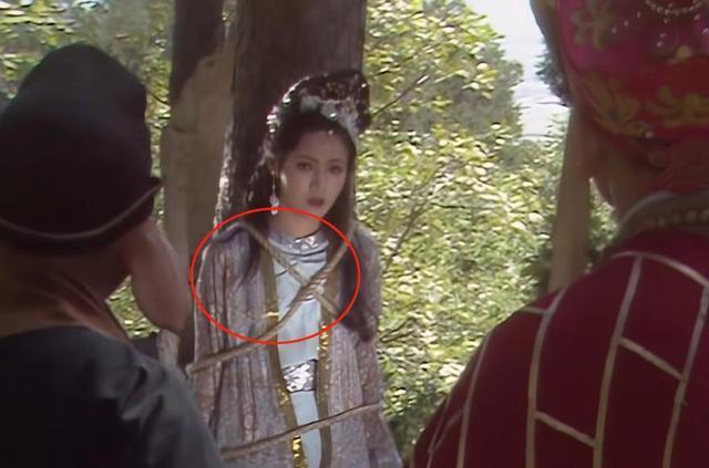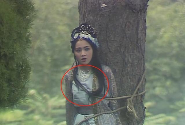 而在老鼠精这一集中,为了能够抓到唐僧,她装作被绑在树木上的软弱女子,此时的老鼠精身上捆绑的绳子明显很松垮。