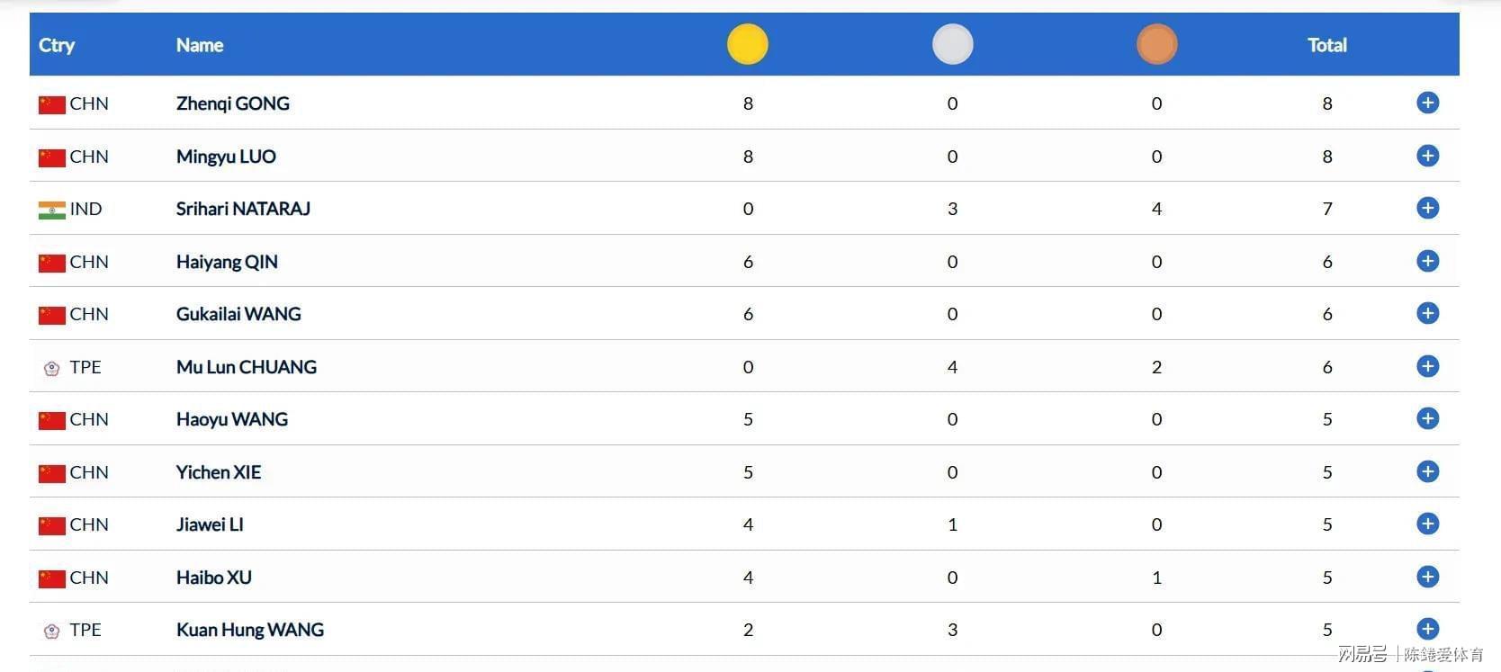 除了中国队在整体奖牌榜方面一枝独秀外,在个人选手奖牌榜方面也是成绩斐然。有两位选手各自拿到8枚金牌,并列排名第一,两人均是来自重庆的罗名钰和龚真琦。两名选手各拿到6枚金牌,排名第二,分别是覃海洋和王谷开来。两名选手各获5金,分别是王浩宇和谢以忱。其他选手方面,李佳蔚4金1银,徐海博4金1铜,周彦君3金1银,王艺静2金1银,李泰裕1金1铜。
