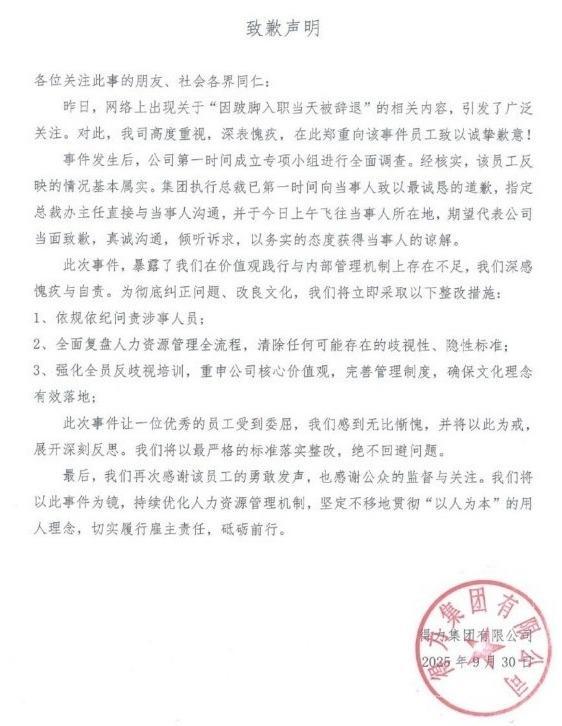 9月30日,一则关于“得力集团辞退跛脚员工”的话题迅速登上微博热搜,引发了社会各界的广泛关注和热烈讨论。当天,得力集团有限公司针对此事件正式发布了《致歉声明》,明确表示涉事员工所反映的情况基本属实,并对此表达了深深的歉意。