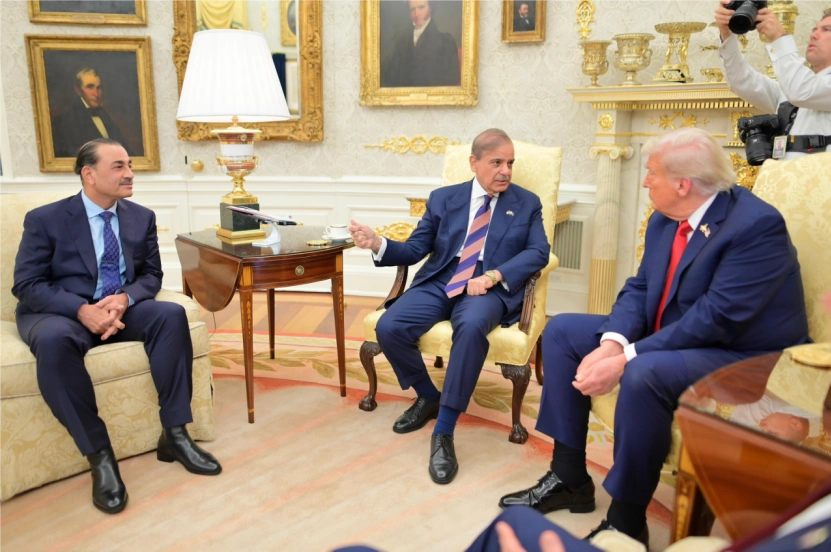 图为特朗普(右)与巴基斯坦总理夏巴兹(中)和陆军参谋长穆尼尔举行会谈