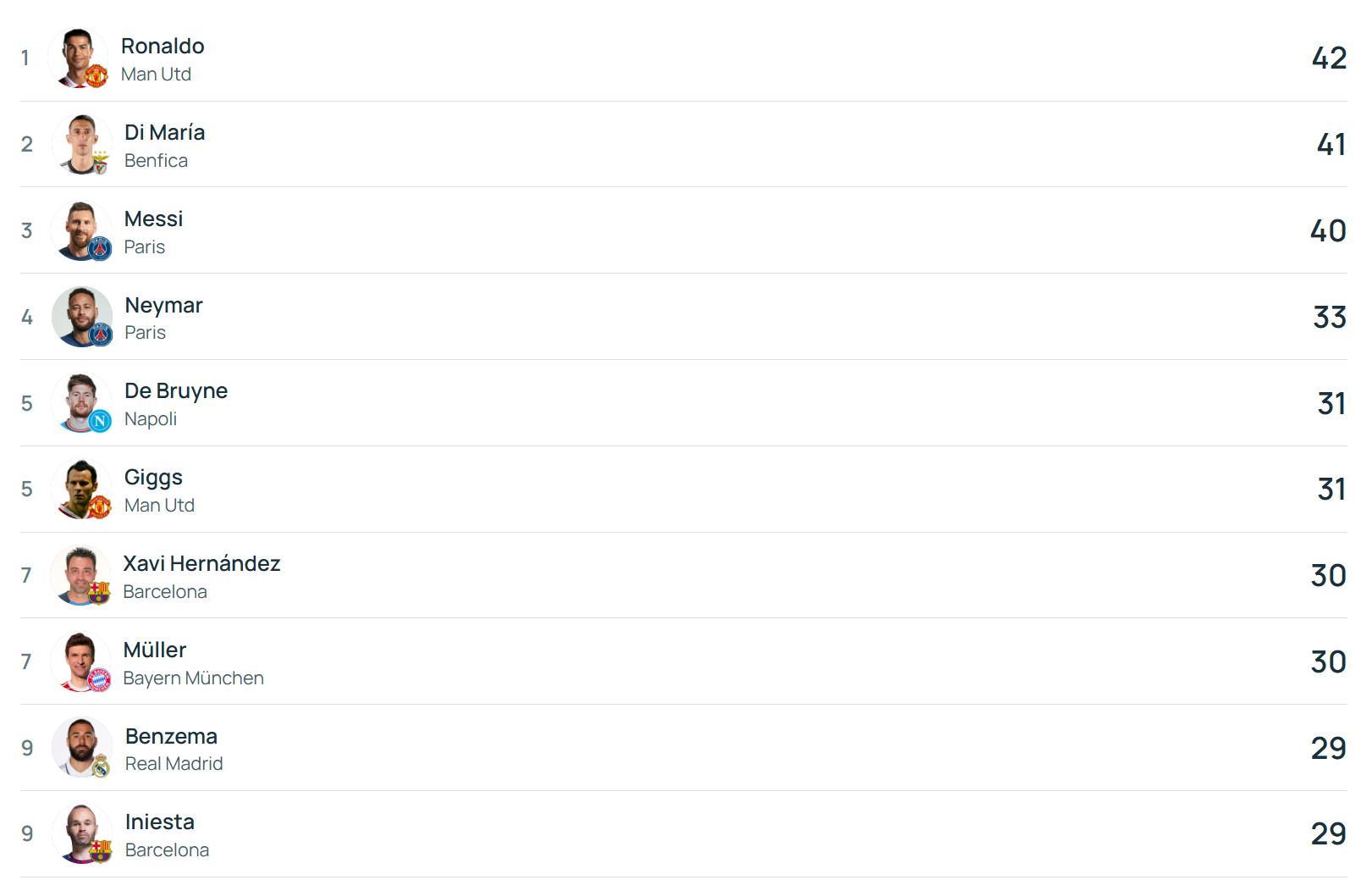 欧冠历史助攻榜top10