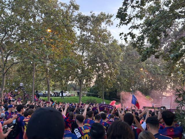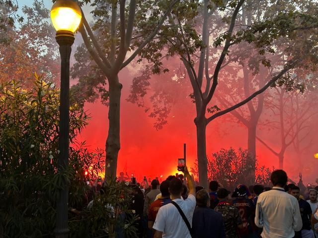 鉴于以上种种恩怨,即使登贝莱因伤无缘这场焦点之战,巴萨死忠球迷也在蒙锥克奥林匹克体育场制造出了剑拔弩张的氛围。他们燃放起红蓝相间的焰火,齐声高喊辱骂大巴黎的口号:“PSG,XX养的。”其敌对程度丝毫不亚于西班牙国家德比,或是对决西班牙人的加泰罗尼亚大区德比战。现场还有不少球迷燃放起信号弹,这一天奥林匹克体育场的安保规模也几乎达到了最大力度,众多安保人员将巴黎远征球迷和巴萨死忠隔开,以避免出现大规模冲突。