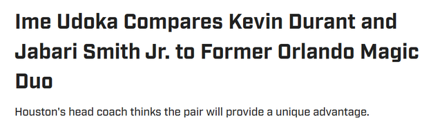 鉴于小贾已取得的进步,他与杜兰特的组合完全能契合火箭队“身高优势+多功能性”的球队定位。无论两人分别担任得分后卫与小前锋,还是小前锋与大前锋,乌度卡都对这对组合充满信心:“他们总有一人能形成明显优势,两人都能内外线兼顾,还能持球完成多种进攻动作。”