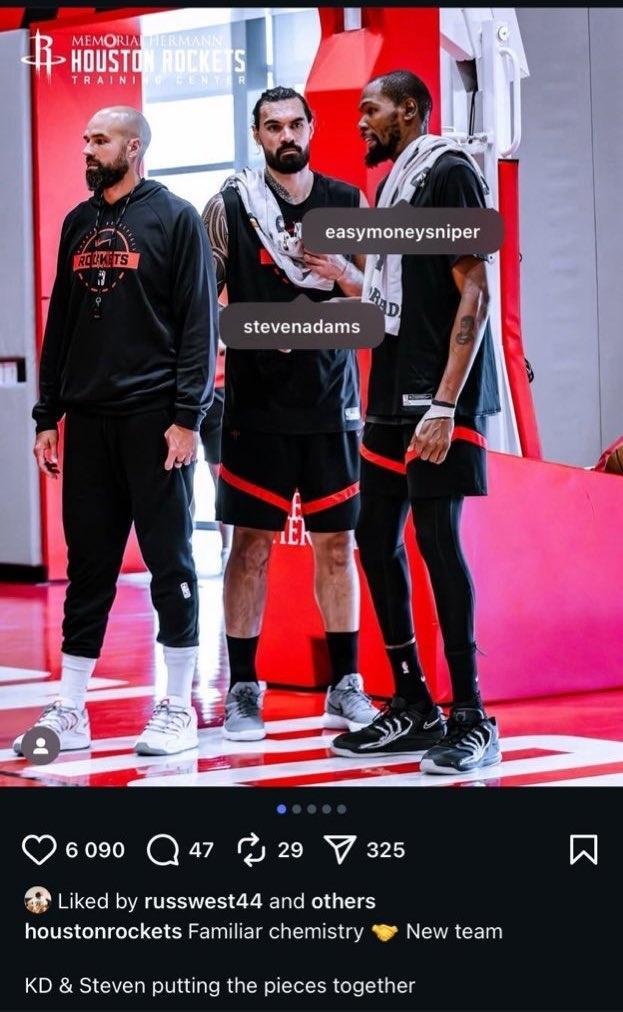 火箭今夏通过七方交易引进杜兰特,并续约亚当斯,促成这对昔日雷霆搭档重聚。官方晒出两人合影并配文:“熟悉的化学反应,新球队!”值得注意的是,威少曾在雷霆时期与杜兰特、亚当斯并肩作战,且2019-20赛季短暂效力火箭时与哈登搭档。此次他点赞火箭官推动态,引发外界对其回归的猜测。