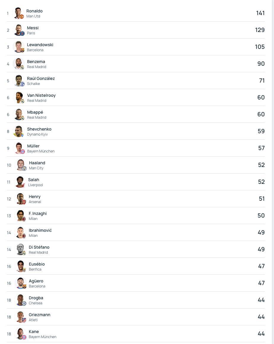 在这份榜单中,C罗以141球的惊人成绩稳居榜首,梅西则以129球紧随其后。莱万多夫斯基、本泽马和劳尔分别位列第三至第五位。而姆巴佩的崛起无疑为这份榜单增添了新的看点,他以60球的成绩与范尼并列第六,展现了其强大的进攻实力。