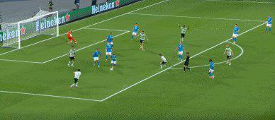 比赛的第36分钟,曼城旧将德布劳内展现出了他出色的反击组织能力。他先是晃过一名防守球员,随后送出一记精准的直塞球,找到了埋伏在对方禁区内的曼联旧将霍伊伦。后者单刀赴会,冷静破门,为那不勒斯先拔头筹。