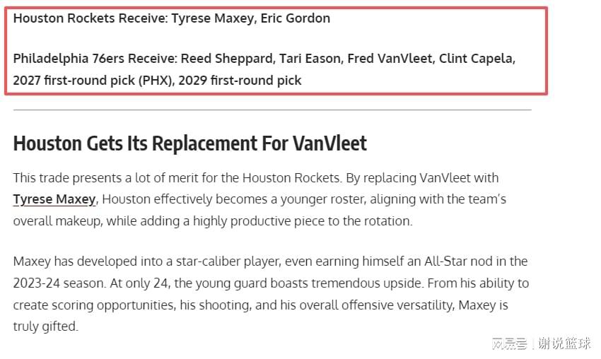 针对这一困境,美国媒体FW提出大胆交易方案:火箭可与76人展开6换2重磅交易,送出范弗利特、谢泼德、伊森、卡佩拉及两个未来首轮签,换取泰雷兹·马克西与36岁老将埃里克·戈登。该方案若成行,将同时解决后场升级与经验补充两大需求。