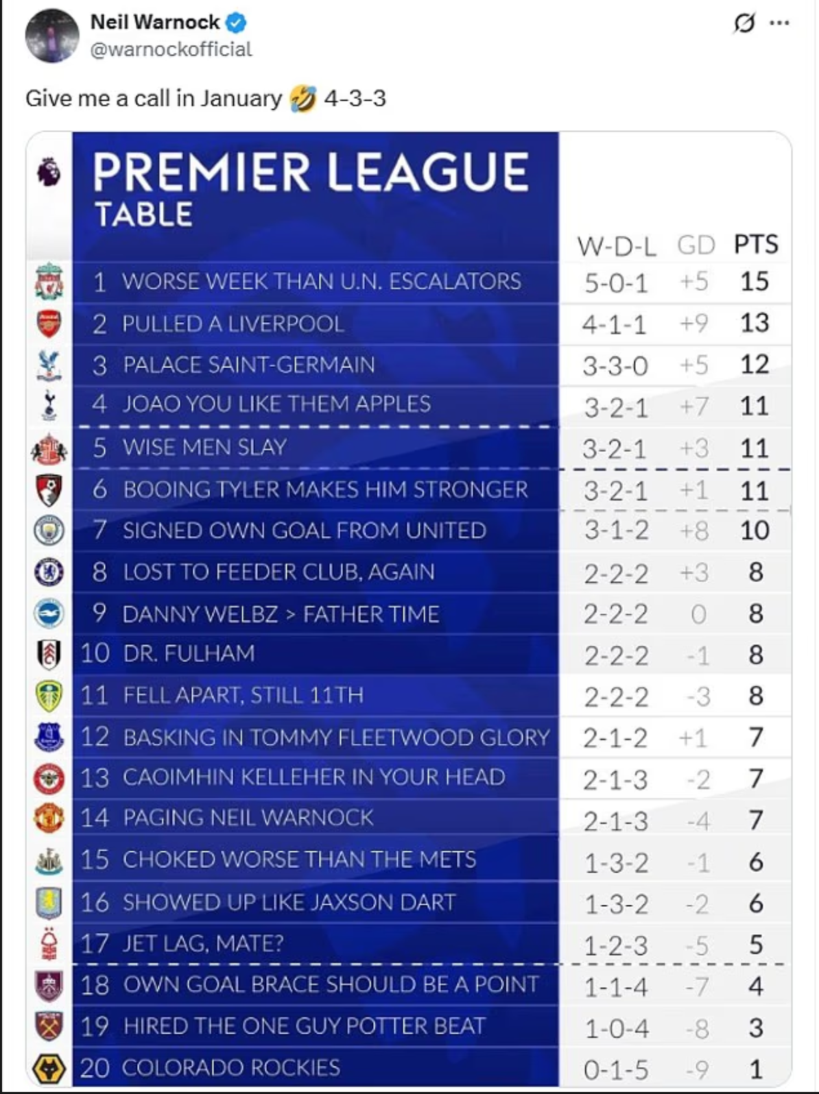 作为英超历史上著名的“救火教练”,沃诺克职业生涯曾执教过20支不同球队,尤其擅长在球队面临降级危机时临危受命,并多次率队成功保级。此次发布的积分榜点评中,他延续了一贯的幽默风格:嘲讽利物浦“经历了比联合国设备更糟糕的一周”,调侃阿森纳“成功拖住了利物浦”,戏称水晶宫为“水晶-圣日耳曼”,更以伯恩利“送对手两个乌龙球却只拿1分”的案例进行揶揄。