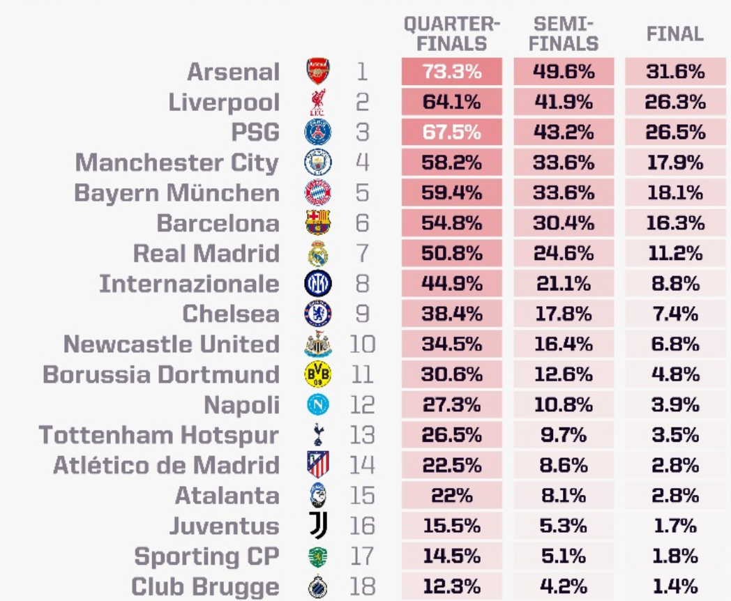 雷速体育10月2日讯,近日,一家权威统计机构利用超级计算机对本赛季欧冠联赛进行了全面预测,结果显示阿森纳成为夺冠的最大热门,其夺冠概率远超利物浦、巴黎圣日耳曼、曼城等传统强队。