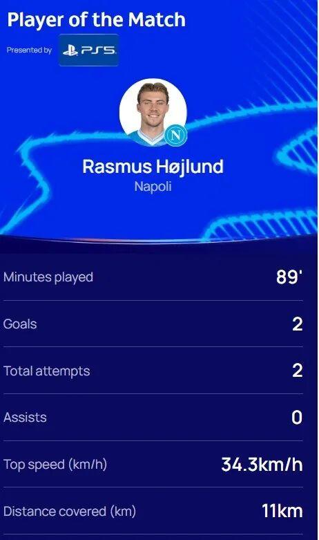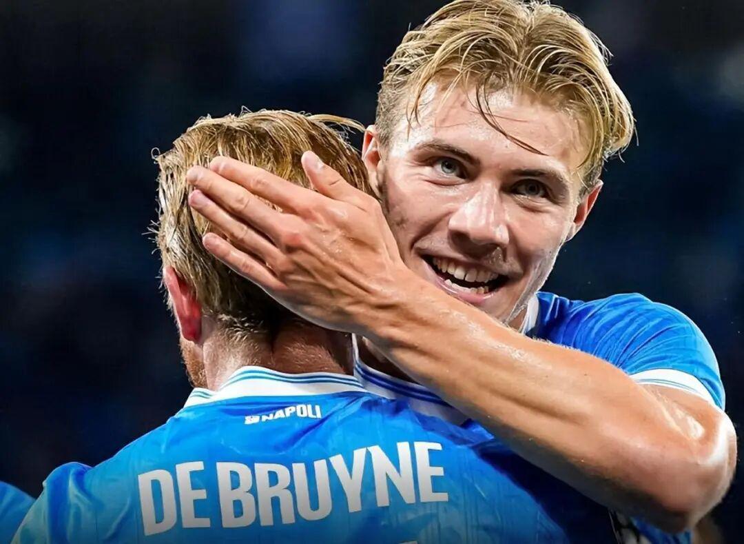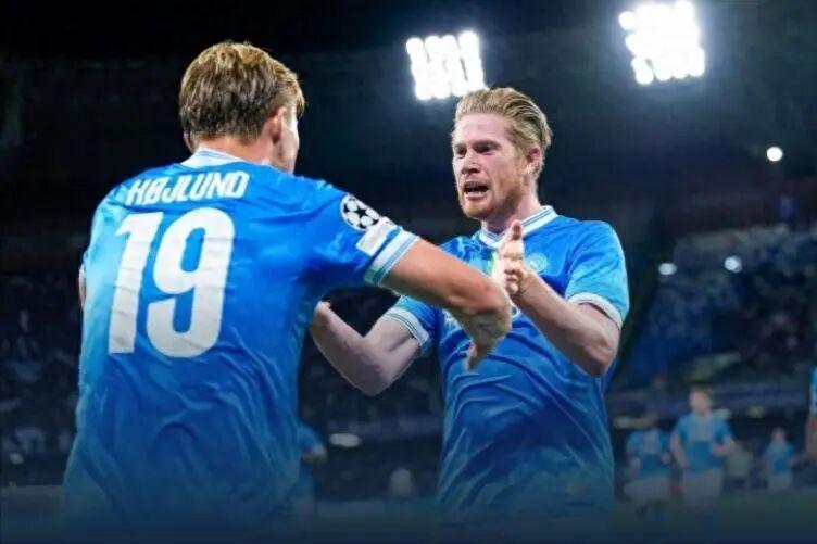 比赛第79分钟,那不勒斯再次通过经典的边路传中、中路抢点的方式扩大了领先优势。德布劳内的传球精准无比,霍伊伦德的抢点也非常积极。面对对方后卫的紧逼和门将的出击,他毫不犹豫地选择了头槌攻门,最终取得了良好的效果。这两个极具英超风格的进球帮助那不勒斯成功锁定了胜局。