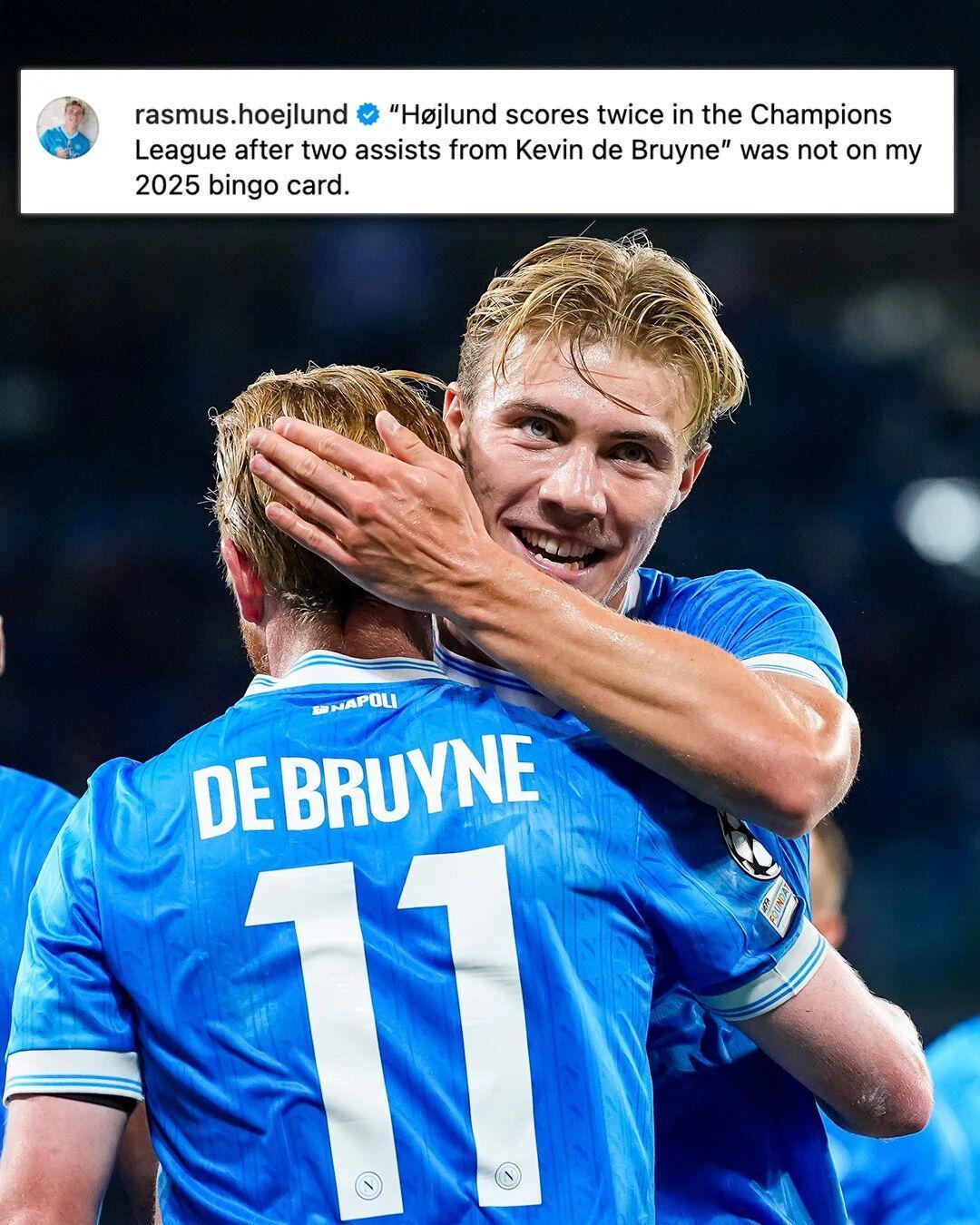 除了进球,霍伊伦在比赛中的其他数据也相当抢眼。他完成了2次射正,6次争顶中4次成功,均为全场最多。这样的全面表现,让他当之无愧地获得了欧冠官方全场最佳球员的荣誉,并在赛后领取了奖杯。赛后,霍伊伦在社交媒体上幽默地写道:“‘霍伊伦在欧冠中梅开二度,两次助攻都来自德布劳内’,这完全不在我2025年的预期清单里。”