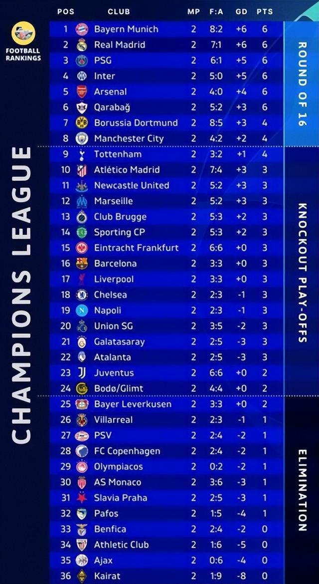 第2轮过后,25-26赛季欧冠联赛阶段的积分榜也进行了更新。拜仁、皇马、巴黎、国米、阿森纳、卡拉巴赫同积6分位列前6,随后是积4分的多特、曼城和热刺。
