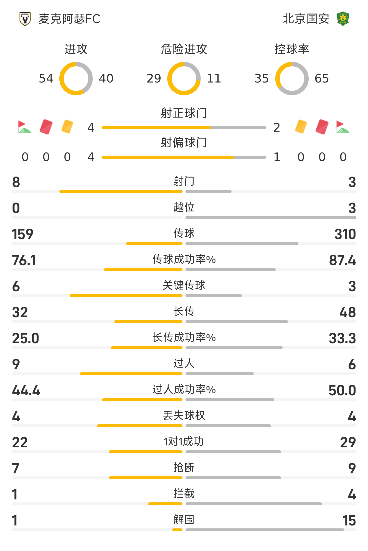 从半场数据来看,国安在控球率上占据了明显的优势,达到了65%,显示出球队在中场的控制力。然而,尽管控球时间较长,但国安在进攻端的效率却不尽如人意,仅有3脚射门尝试,相比之下,麦克阿瑟FC则完成了8次射门,其中4次射正,给国安的球门带来了不小的威胁。