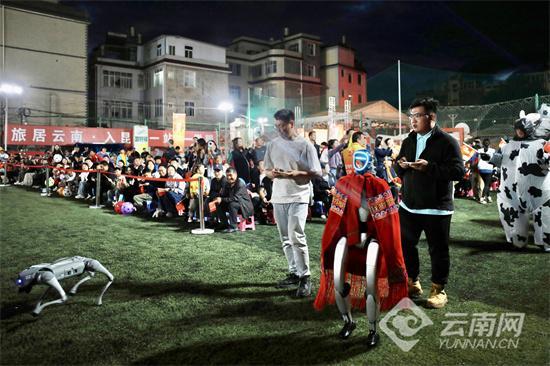 开幕式上,科技与传统的碰撞成为全场焦点。昆明宇森科技带来的智能机器人与机器狗率先点燃现场气氛。身着舞狮服的机器狗伴随锣鼓节奏完成腾空、甩尾等高难度动作,引得观众纷纷拍照;1.5米高的智能机器人则化身“社交达人”,通过AI交互系统识别观众情绪,做出挥手、比心等互动动作,让科技充满温度。