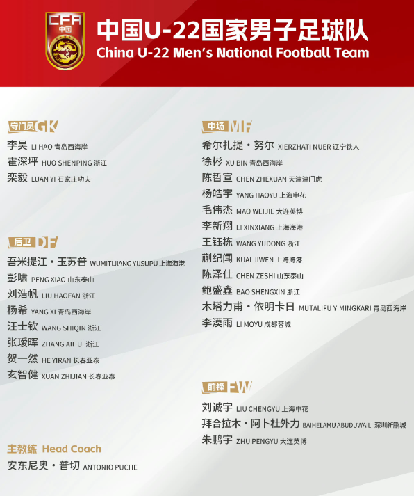 U22国足详细集训名单如下: