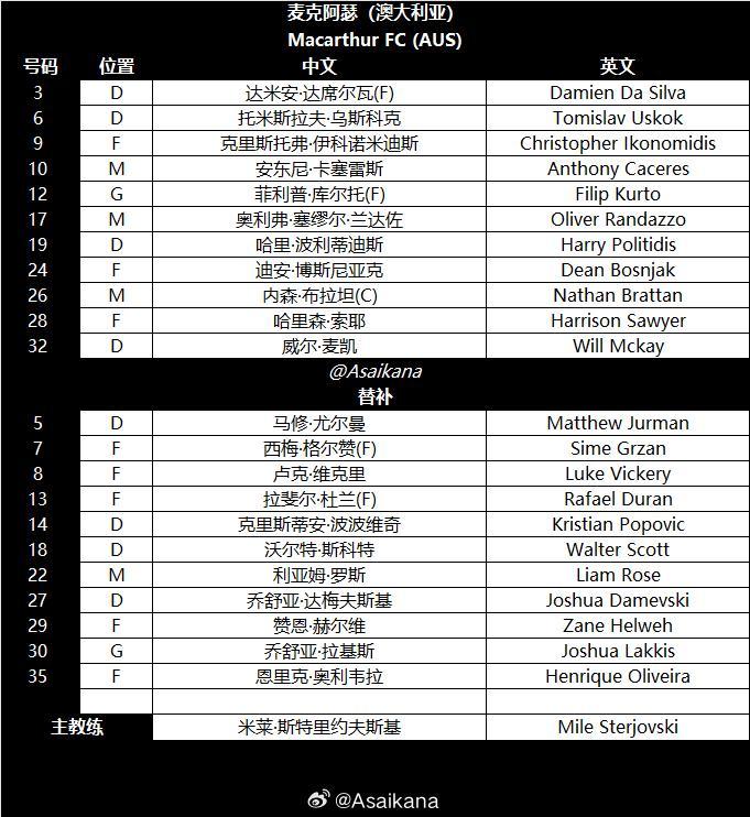 而麦克阿瑟FC方面,也派出了强阵迎战。他们的首发阵容包括12号库尔托、3号达席尔瓦、6号乌斯科克等实力球员,中场由26号布拉坦、10号卡塞雷斯等人坐镇,锋线上则有9号伊科诺米迪斯等攻击手。替补席上,麦克阿瑟FC也拥有1号罗宾逊、30号拉基斯等实力不俗的球员,随时准备为球队贡献力量。