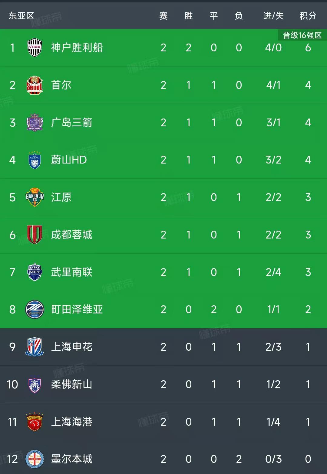 东亚区积分榜上,日韩球队依然占据主导地位。J联赛冠军神户胜利船本轮凭借汰木康也的绝杀球,1-0小胜墨尔本城,收获两连胜积6分领跑积分榜。墨尔本城则成为唯一两连败的球队。