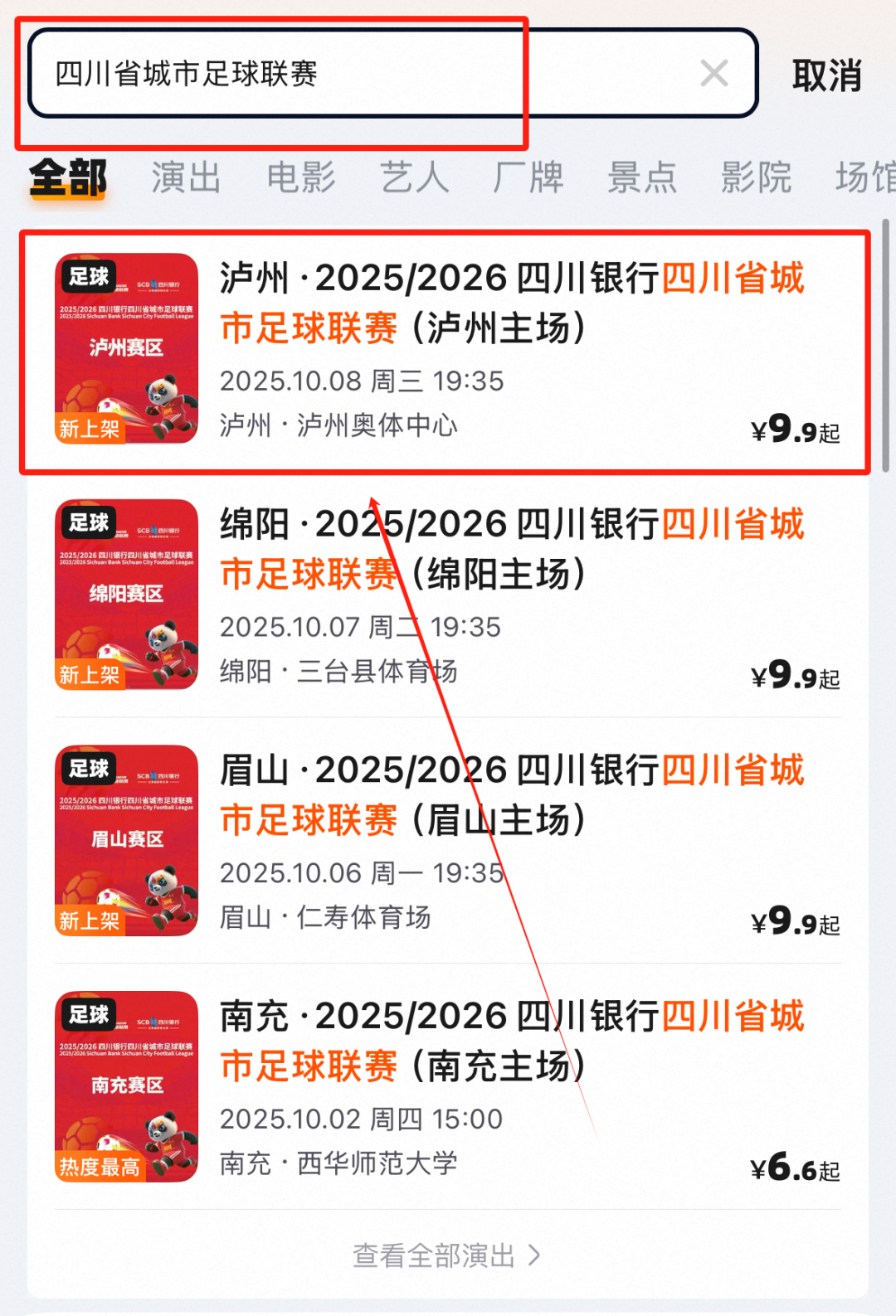 购票步骤:打开浏览器/微信小程序搜索“大麦网”,或下载“大麦”app,在首页搜索栏输入“四川省城市足球联赛”,即可出现相关赛事场次信息。