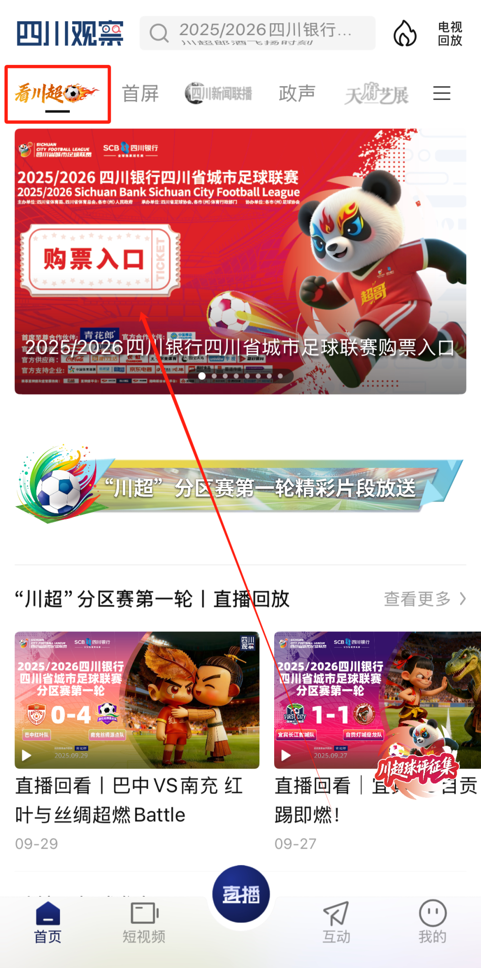 购票步骤:在四川观察APP首页左上角找到“看川超”按钮,即可点击进入“购票入口”。
