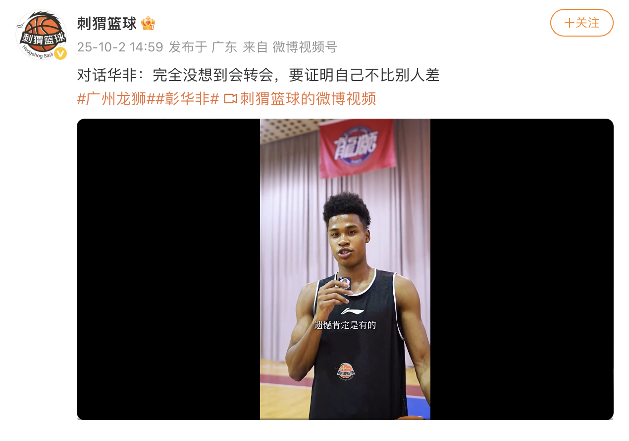 雷速体育10月2日讯 近日,广州队新援彰华非在接受“刺猬篮球”采访时,敞开心扉,分享了自己转会前后的心路历程,以及对未来篮球生涯的期待。