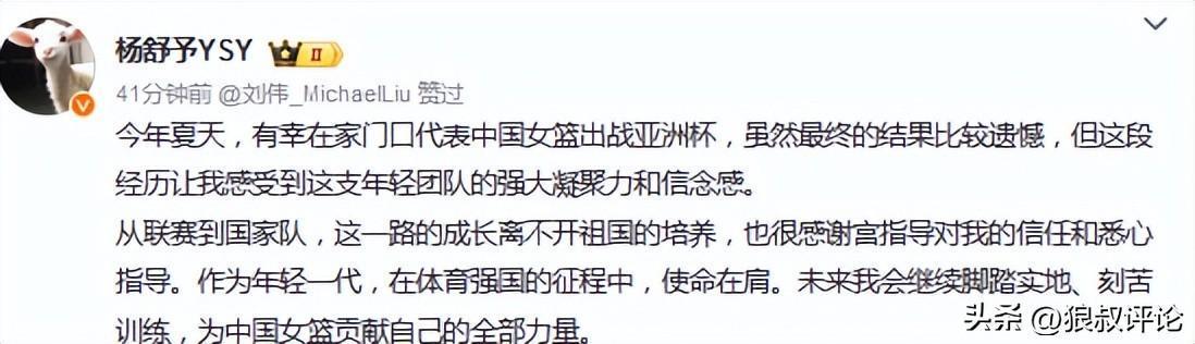 北京时间10月2日,中国女篮的核心球员杨舒予在社交媒体上发文,就国庆假期期间与篮球相关的话题发表了自己的看法。