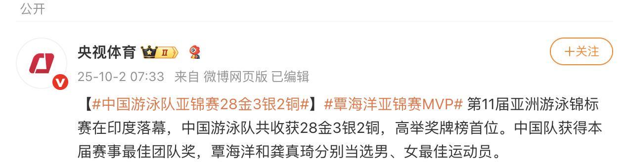 据@央视体育 最新消息,第11届亚洲游泳锦标赛在印度顺利落下帷幕。本届赛事中,中国游泳队表现卓越,以28枚金牌、3枚银牌和2枚铜牌的优异成绩,稳居奖牌榜首位,展现了强大的竞技实力。