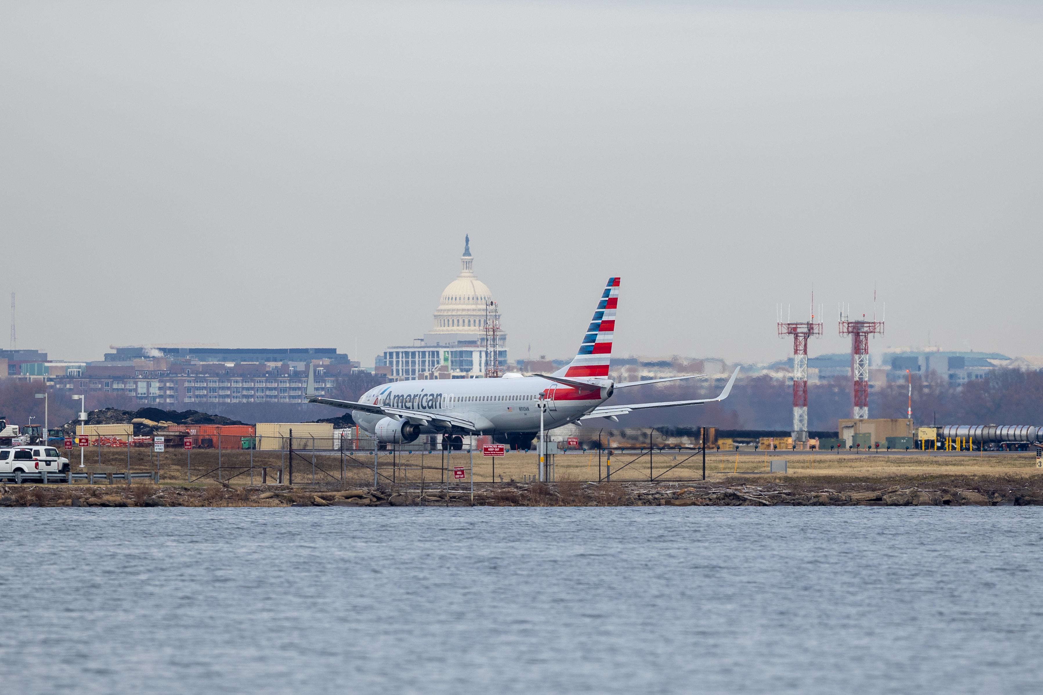 2024年12月24日,一架美国航空公司飞机在美国弗吉尼亚州阿灵顿的里根国家机场准备起飞。新华社记者胡友松摄