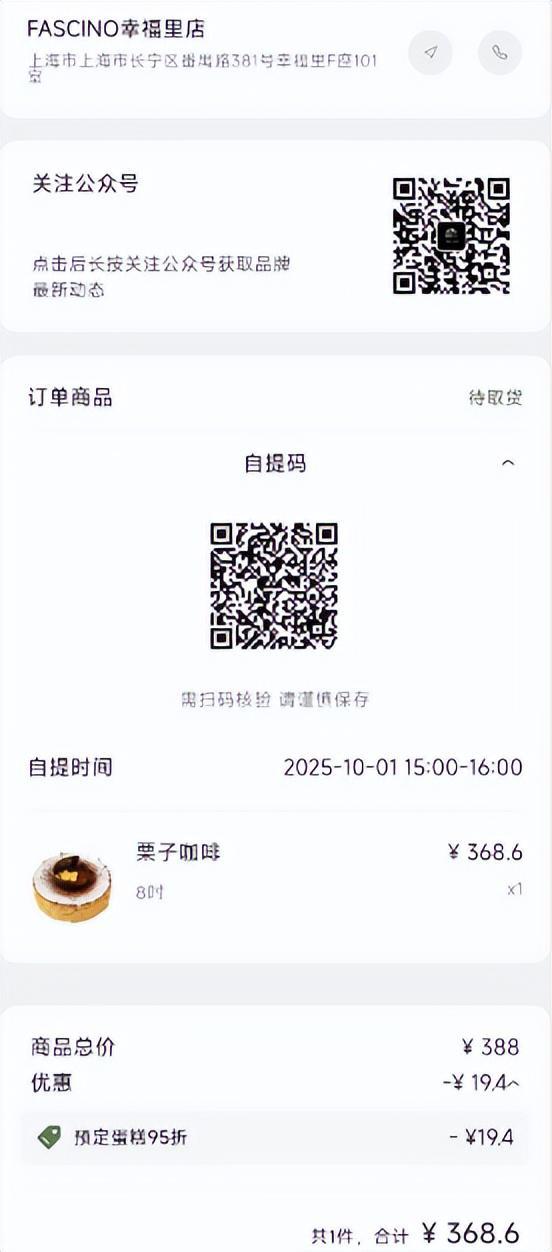 9月22日,叶女士在长宁区番禺路381号幸福里F座101室的FASCINO BAKERY门店内,通过小程序下单了一只8吋栗子咖啡蛋糕,实付368.6元。"栗子加咖啡,这是外婆中意的款式,我们全家都很重视这次寿宴。"