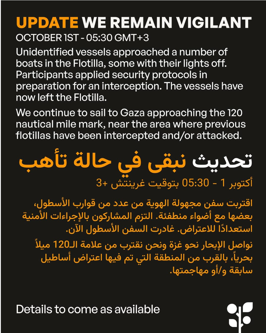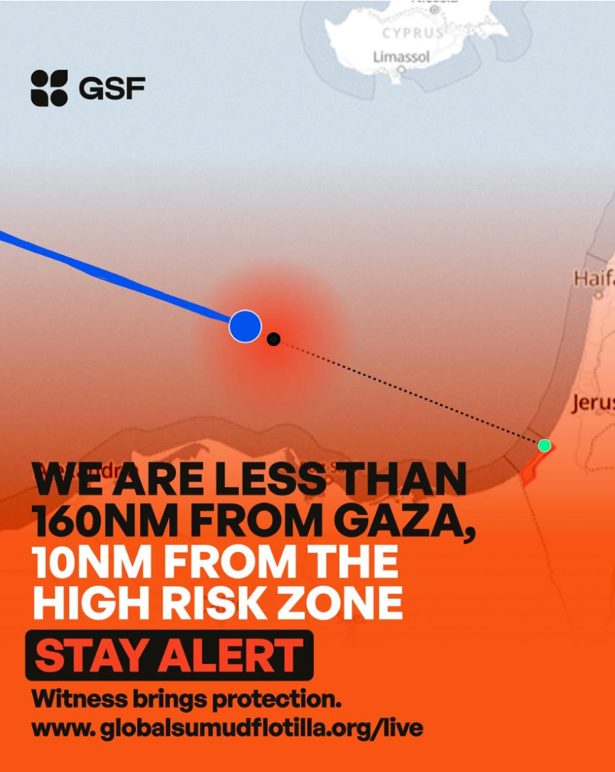 全球苏木德舰队目前距离加沙约120海里,其行动动态通过组织Instagram页面持续更新。该舰队在进入以色列干扰区后,无人机活动显著增加,引发国际社会高度关注。