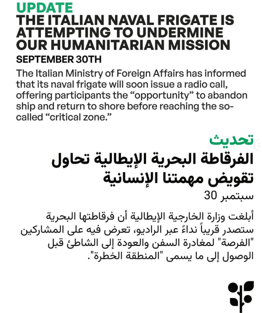 梅洛尼在声明中指出:"许多人试图破坏和平计划,我担心舰队突破封锁的行为会提供借口。现在应是停止航行的时候。"随后,意大利外交部通过无线电要求参与者弃船,但遭到舰队"保护变破坏"的强烈反驳。
