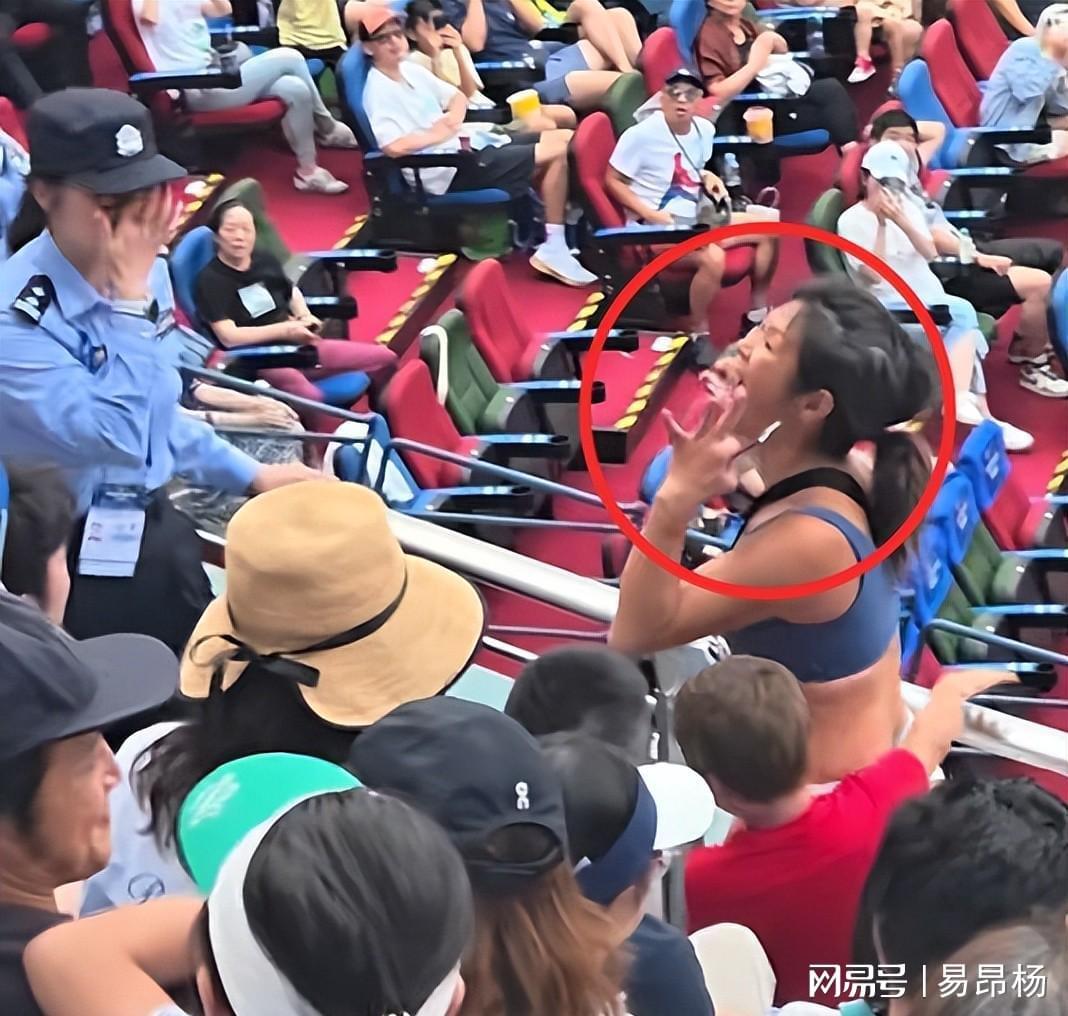 当日下午4时许,正值意大利选手贝雷蒂尼与法国选手马纳里诺的男单首轮激战。看台上身着背心的谢某某突然开始用英语高声喧哗,全程对着远处安保人员做出挑衅手势。更令人震惊的是,她竟掏出瑞典护照高举过头,面露嚣张之色,仿佛在宣告某种“特权”。
