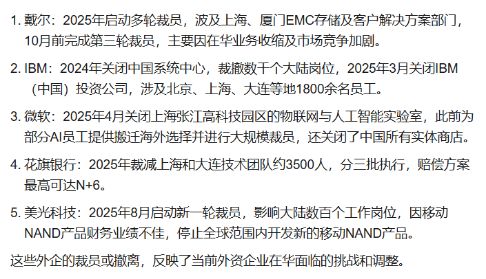 更早的2024年,IBM关闭了在中国的投资公司,北京、上海、大连等地的近2000名员工在短短三分钟内收到裁员通知。这些案例表明,外企在华调整已非个别现象,而是形成了一种趋势。