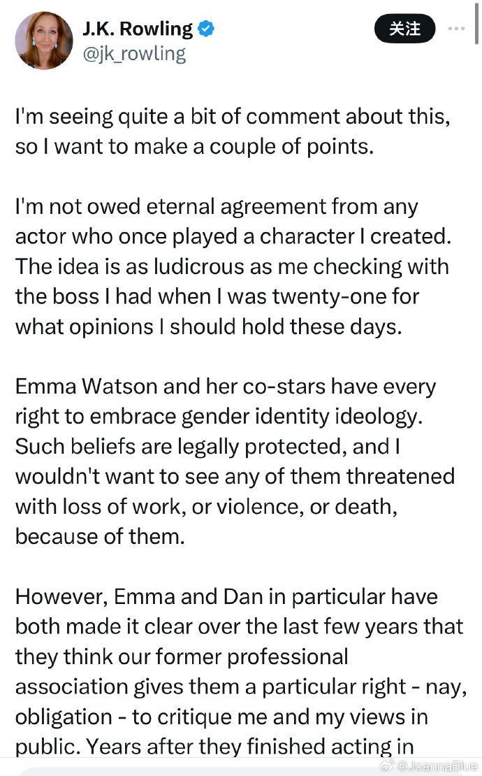 这场风波始于2019年罗琳针对跨性别议题的公开言论。当时,罗琳在社交媒体发表观点后引发争议,艾玛·沃特森随即公开批评其立场,被外界解读为“站队反对派”。罗琳在最新推文中首次披露,自己在争议期间曾遭遇死亡威胁与人身攻击,但始终未对外提及与艾玛的分歧,更未主动公开矛盾。