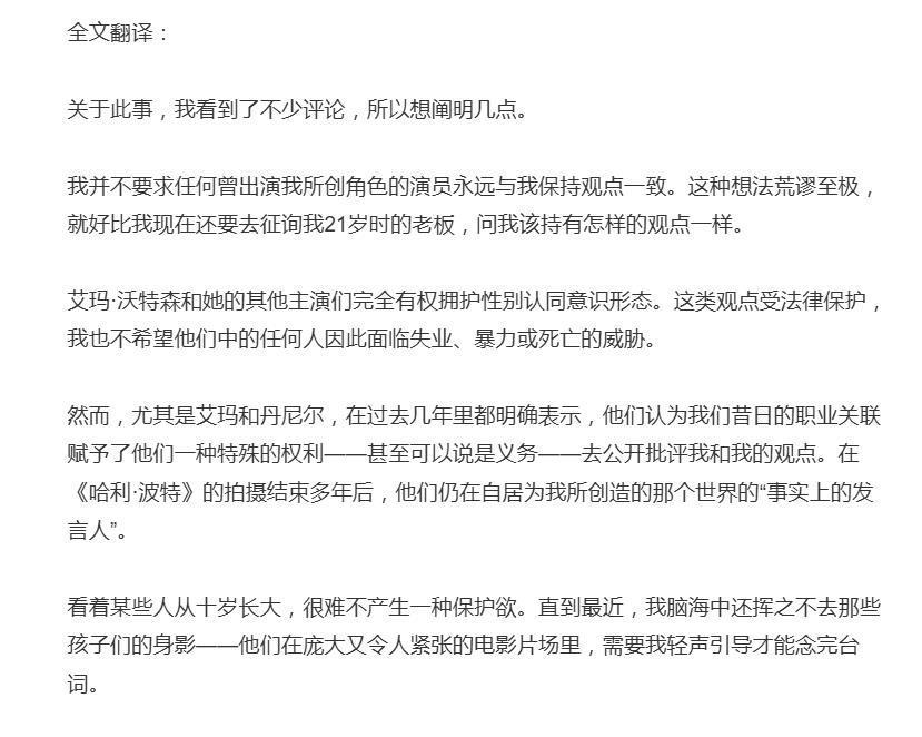 罗琳进一步直指艾玛态度转变的深层动机:“她发现如今谴责我已不再时髦,才急忙想修复形象。”文中虽未直接否定艾玛的立场,却强烈质疑其动机与真诚性。在罗琳看来,这位“在娱乐圈被财富与名气呵护长大”的后辈,似乎从未真正理解普通人所面对的复杂现实。