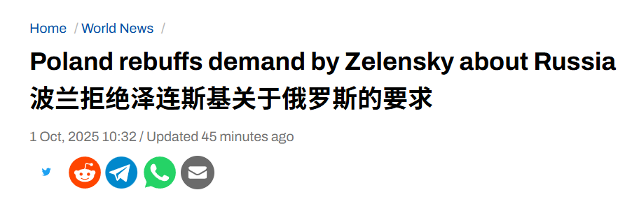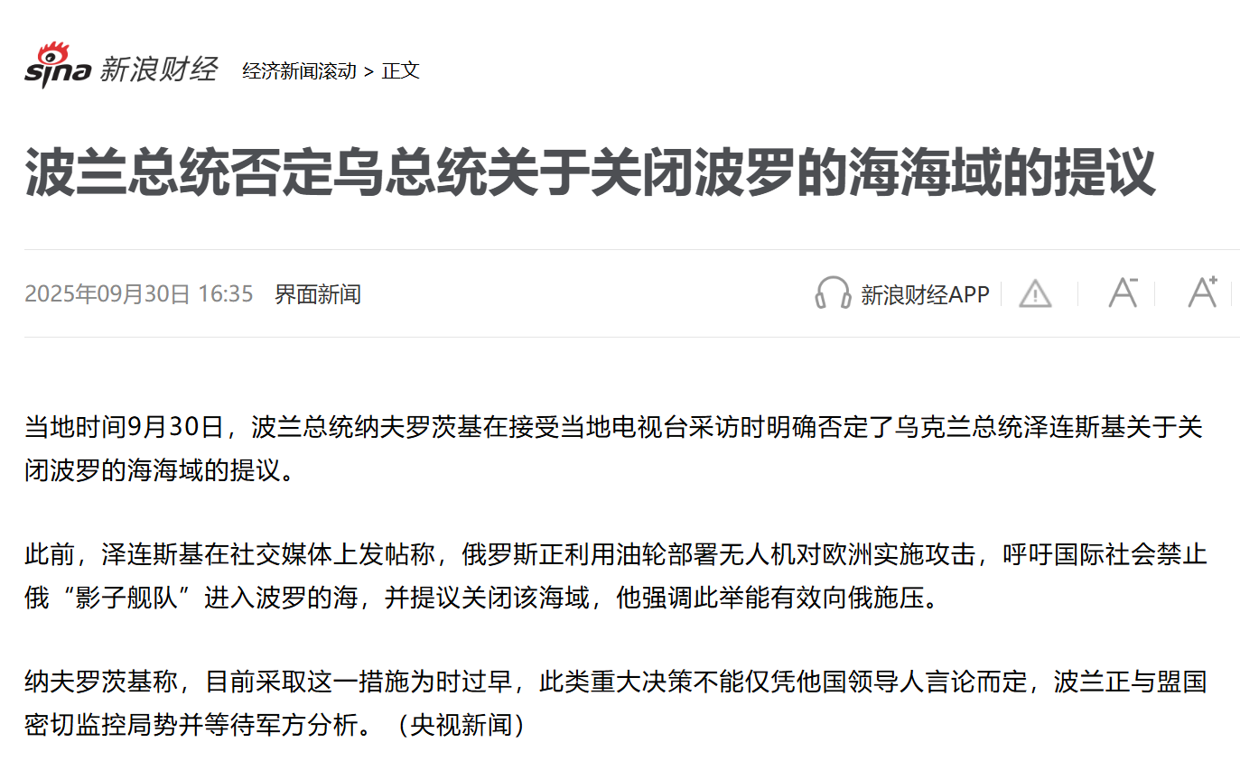 9月30日,波兰总统纳夫罗茨基在公开场合明确拒绝了乌克兰总统泽连斯基提出的“封锁波罗的海”提议,并发表了引发乌克兰社交媒体热议的言论:“波兰的利益优先于乌克兰的利益。”