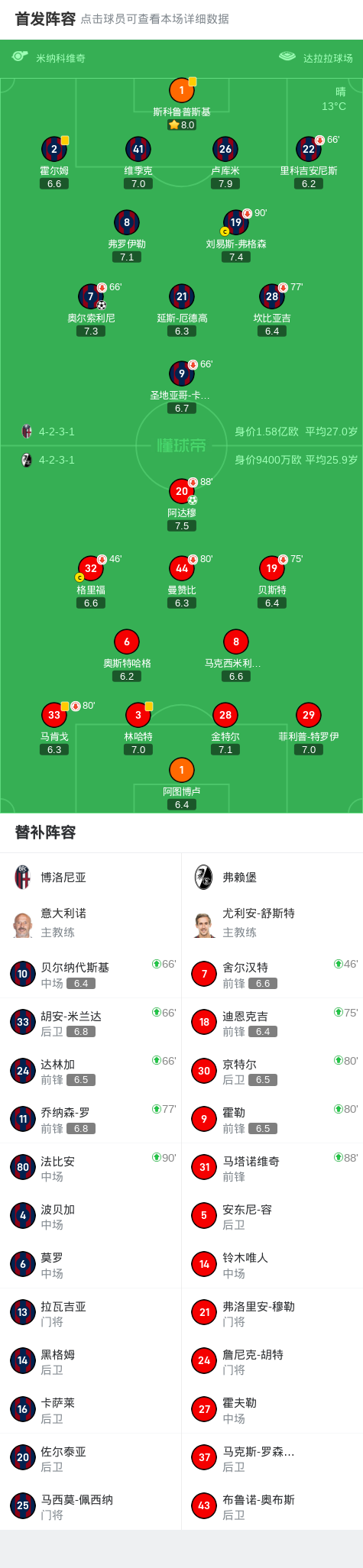 本场比赛,双方球员都展现出了极高的竞技水平。技术统计方面,博洛尼亚和弗赖堡在控球率、射门次数等方面都势均力敌,这也反映了比赛的激烈程度。
