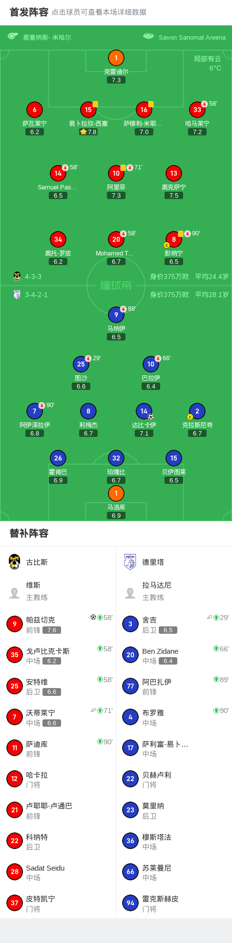 然而,德里塔并未因此气馁。仅仅6分钟后,德里塔便作出了有力的回应。舍吉在中场附近送出一记极具穿透力的直塞球,达比卡伊迅速插上,面对出击的门将冷静推射破门,将比分扳平为1比1。这一进球不仅展现了德里塔队员的顽强斗志,也使得比赛的悬念得以延续。