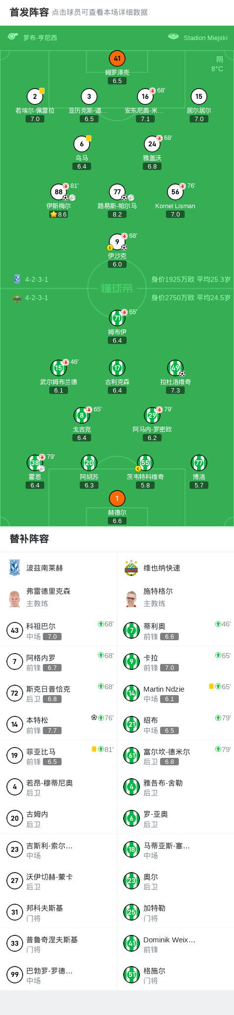 上半场补时阶段,波兹南莱赫卷土重来。路易斯-帕尔马送出精准助攻,伊斯梅尔冷静推射破门,将比分改写为3-0。易边再战,维也纳快速展开反击。第64分钟,霍恩助攻拉杜洛维奇打入一球,为客队扳回一城。然而,波兹南莱赫并未给对手太多机会。第77分钟,伊斯梅尔送出关键传球,本特松推射得手,将比分锁定为4-1。