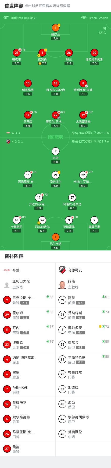 比赛第41分钟成为全场转折点,布兰队通过流畅的进攻配合撕开对手防线:费利克斯-米勒在右路送出精准传中,埋伏在禁区中路的赛瓦尔-马格努松机敏插上,凌空抽射将球送入网窝。这粒价值连城的进球不仅展现了挪威球队的战术执行力,更让主队带着1球优势进入下半场。