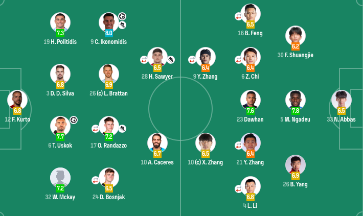 后卫:32-威尔·麦凯、3-达米安·达席尔瓦、6-托米斯拉夫·乌斯科克、19-哈里·波利蒂迪斯(92'29-赞恩·赫尔维)